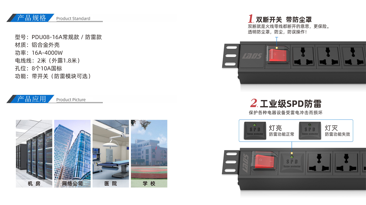雷迪司 8位萬(wàn)用帶總控開(kāi)關(guān)PDU 16A插頭